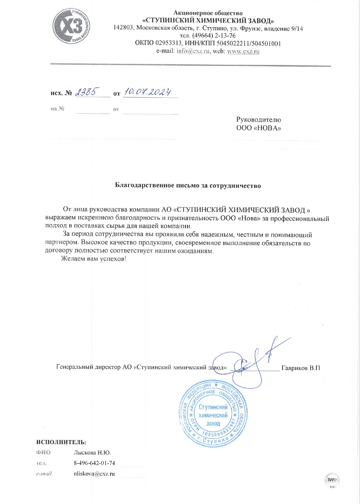 Благодарность ООО "Нова" от АО "Ступинский химический завод"