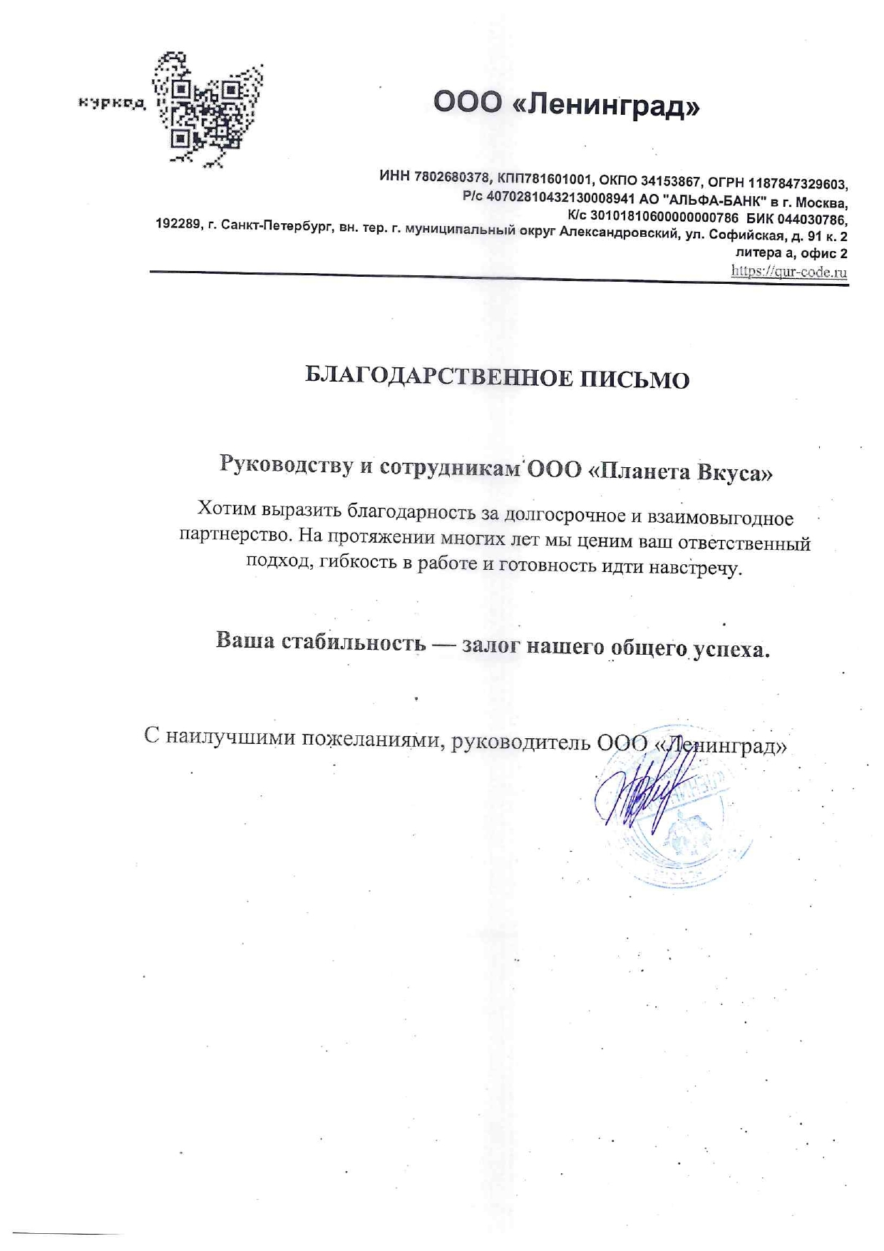 Благодарность от ООО "Ленинград"
