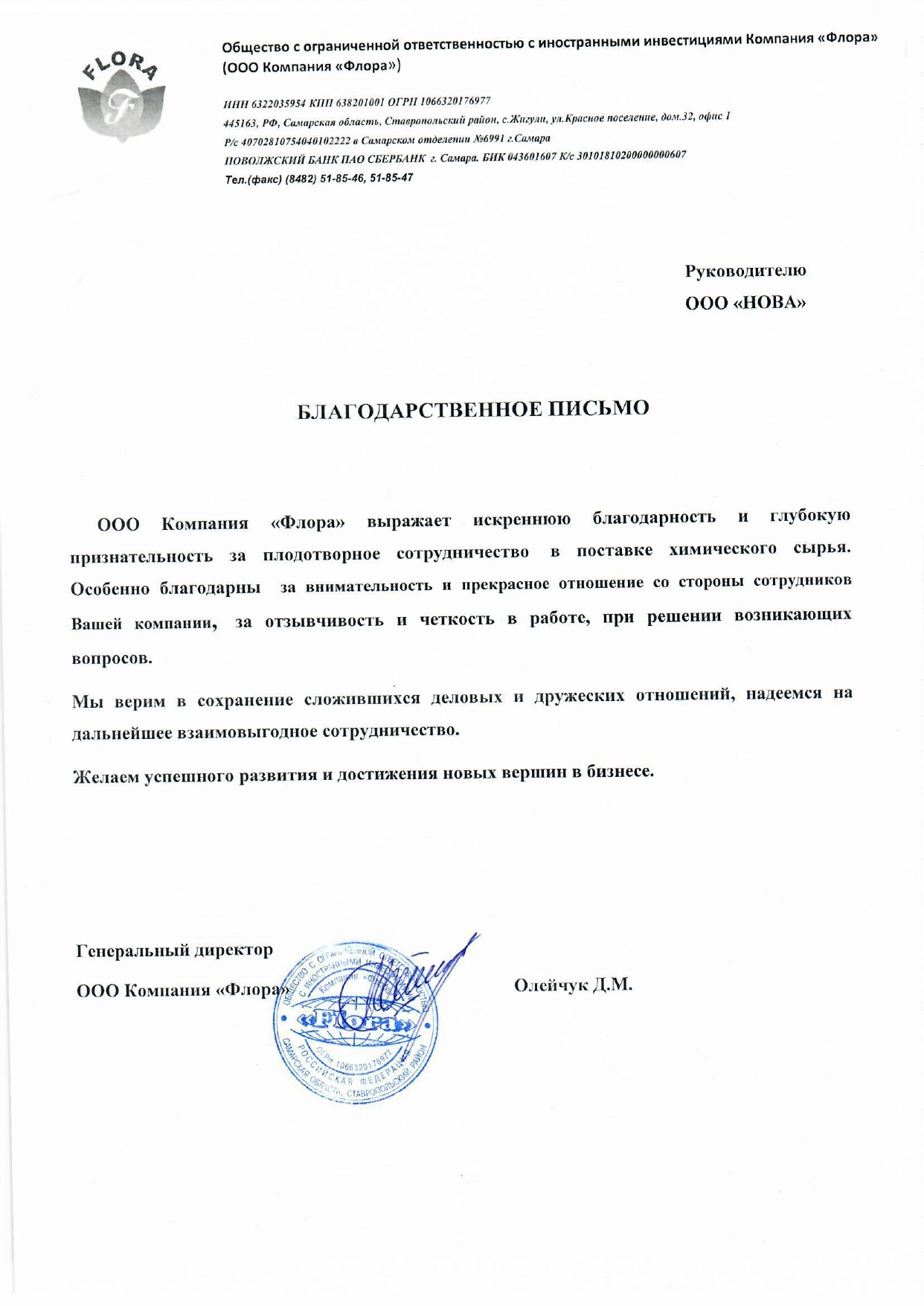 Благодарность ООО "Нова" от ООО Компания "Флора"