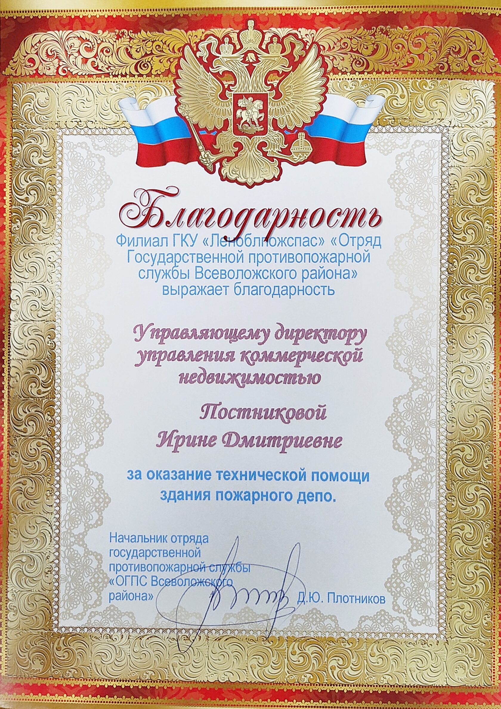 Благодарность от филиала ГКУ "Леноблпожспас"